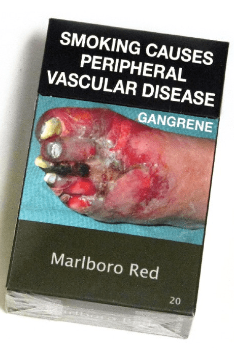 It’s a far cry from today’s ads which, frankly, are a bit of a downer. They’re all about death and losing parts of your body. And the colour scheme on the packets is horrendous. If the cheesy arteries don’t put you off, the baby vomit-coloured packaging will. Here are a few of my favourites in ascending order of morbidity…